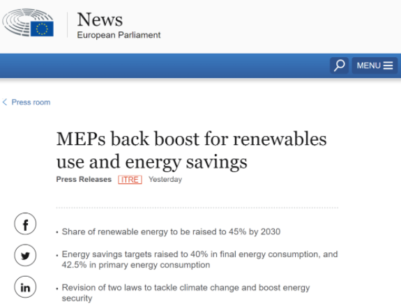 歐盟時間2022年7月13日,歐盟議會以54票贊成、14 票反對和 6 票棄權(quán)通過了提升可再生能源占比的法案修正案,該法案由ITRE(歐洲議會的工業(yè)、研究和能源委員會)提交。